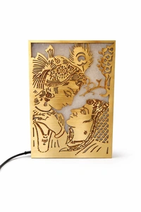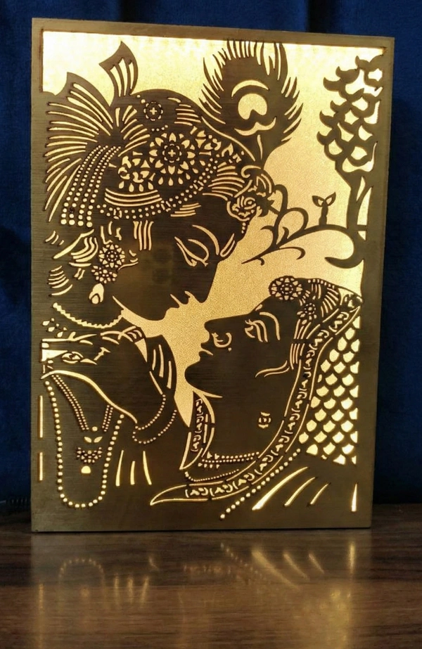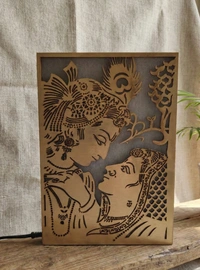 Radha Krishna Golden MDF Portrait Light Box | Laser Cut Decorative LED Lamp | Warm White Sparkle Light | Wooden Home Décor | 8 x 12 Inch approx